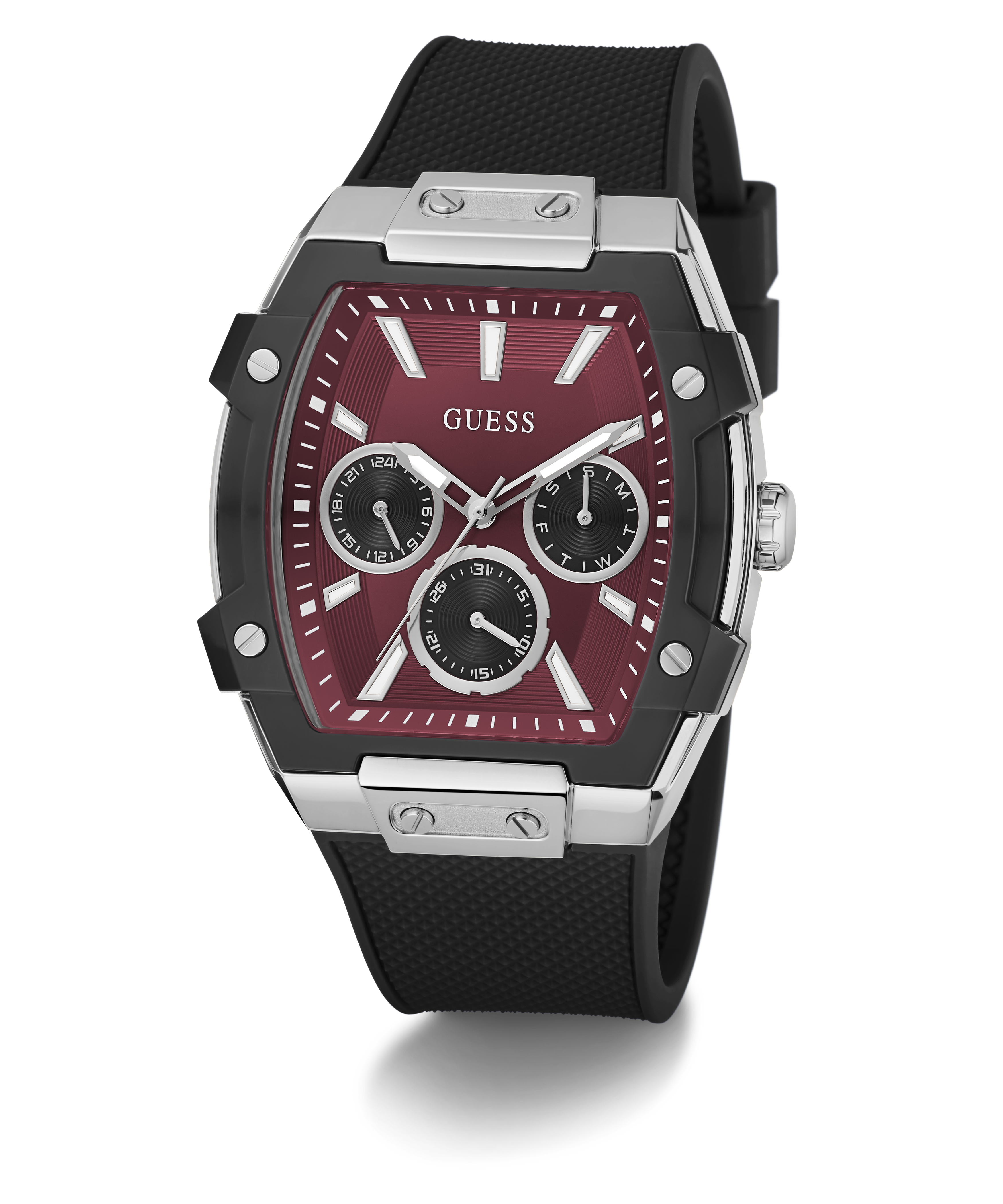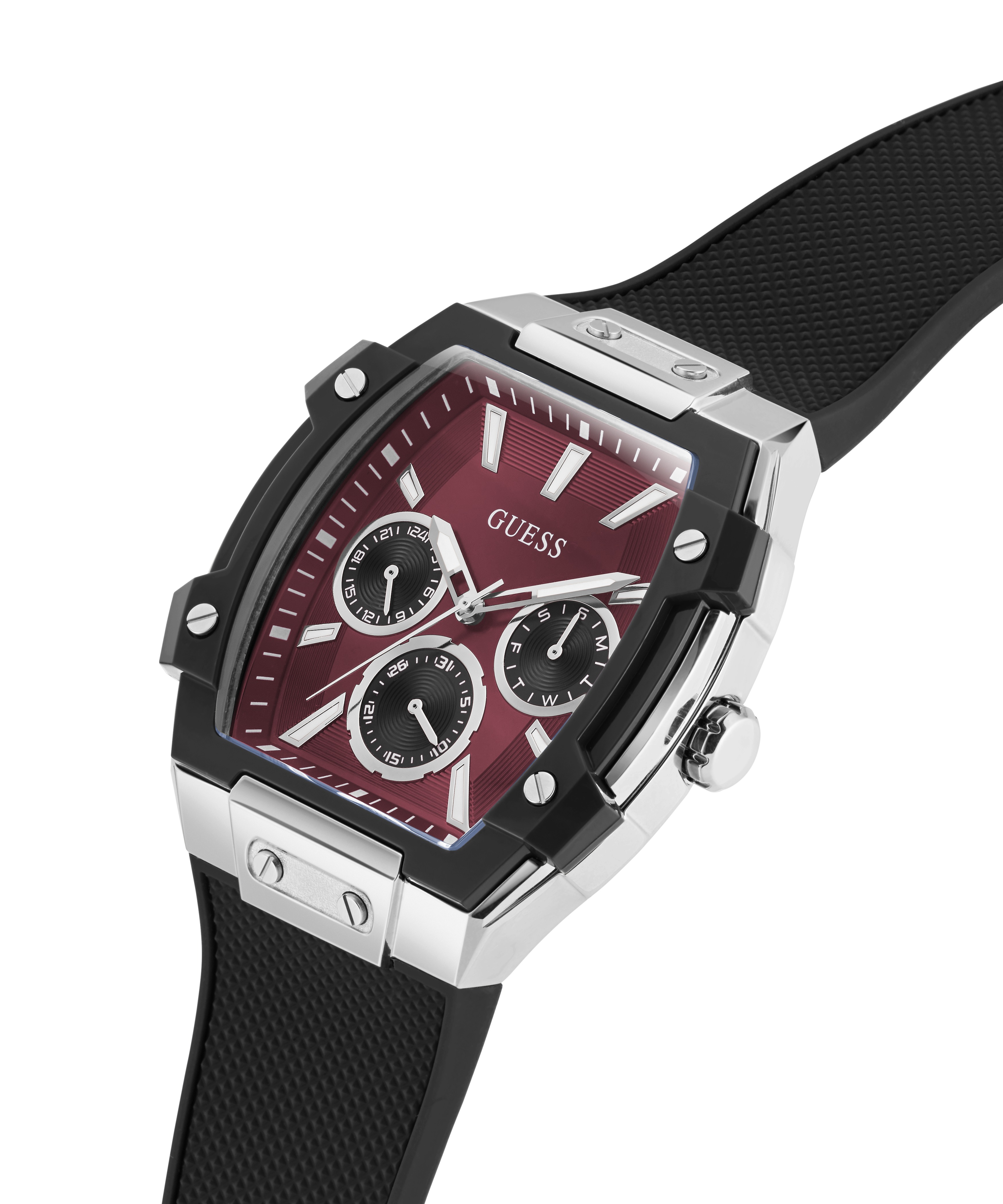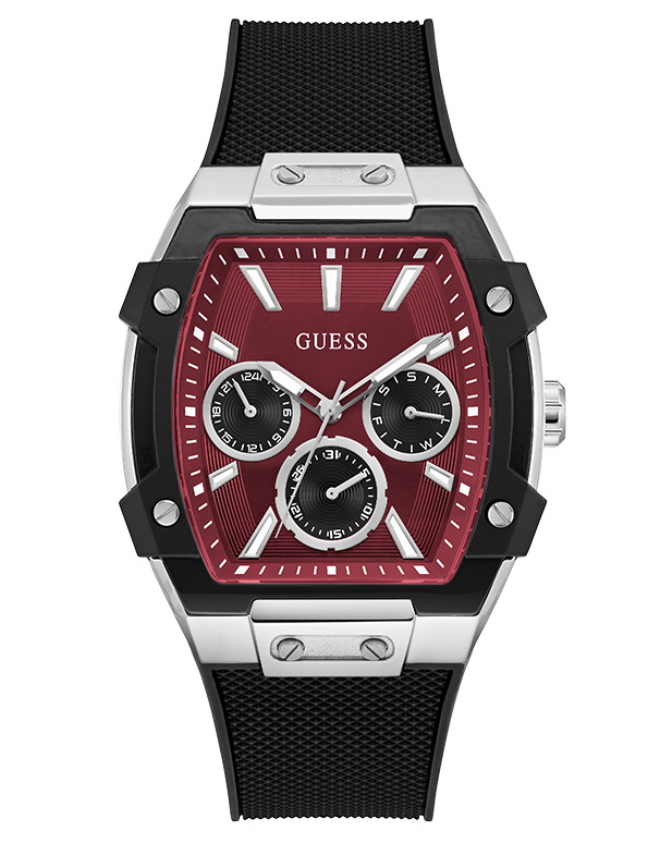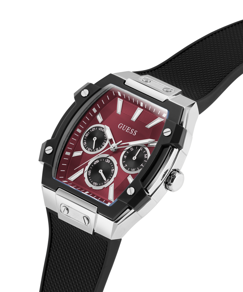 This 44 mm rectangular-shaped statement piece brings the heat with its deep red multifunction dial. The sharp contrast of the silver case, black strap and saturated red face defines the silhouette. Every element works in harmony to amplify the intensity of the red dial while keeping the design sleek and cohesive.