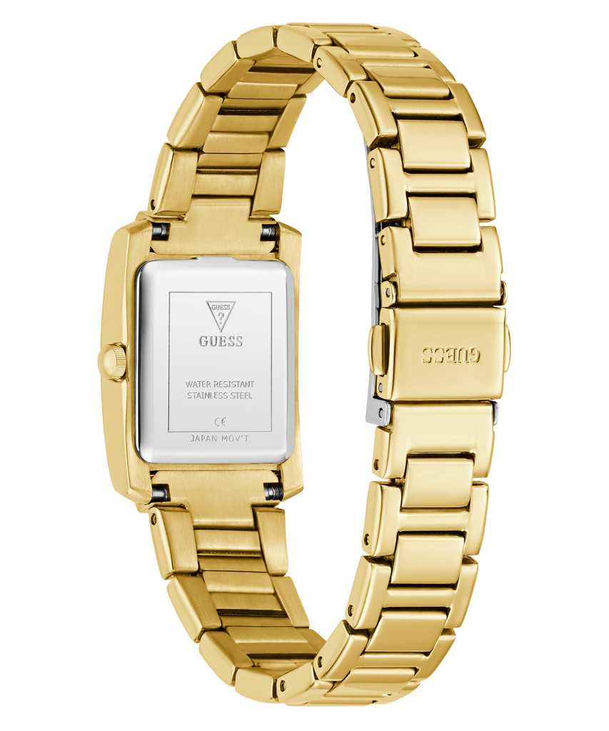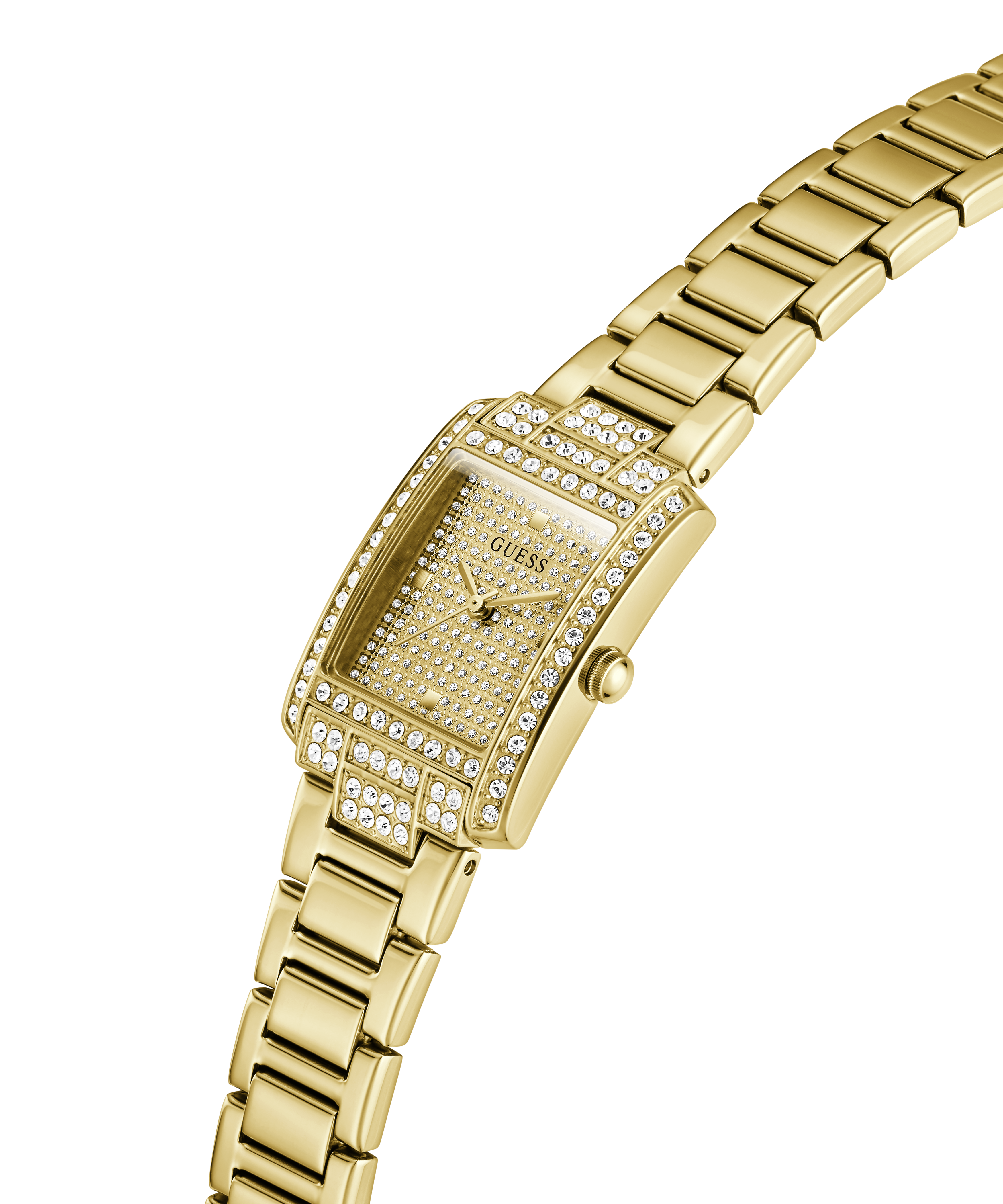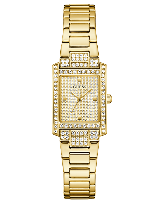 This head-turning rectangular design delivers pure shine from every angle. The polished gold-tone case creates a sleek, mirror-like frame, while the fully glitzed champagne dial brings a field of sparkle that catches even the softest light. Every edge of the bezel is trimmed with crystals, creating a radiant halo effect that feels unmistakably luxurious.