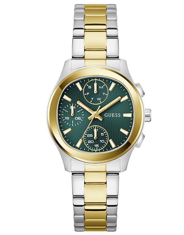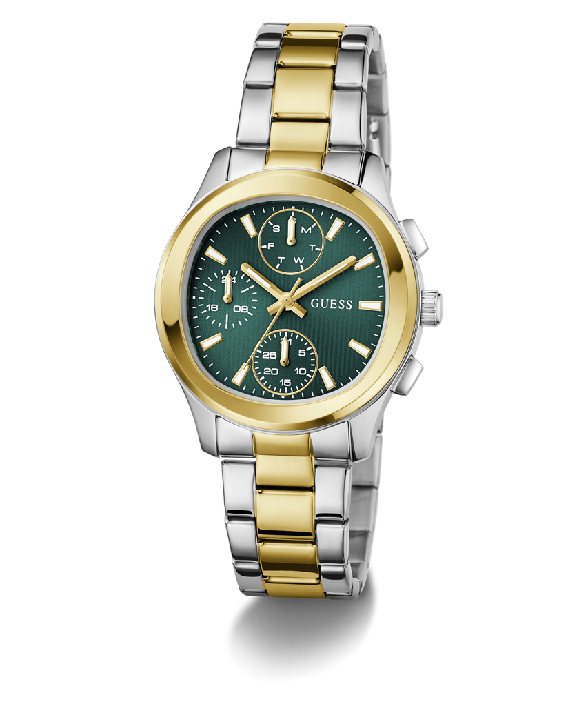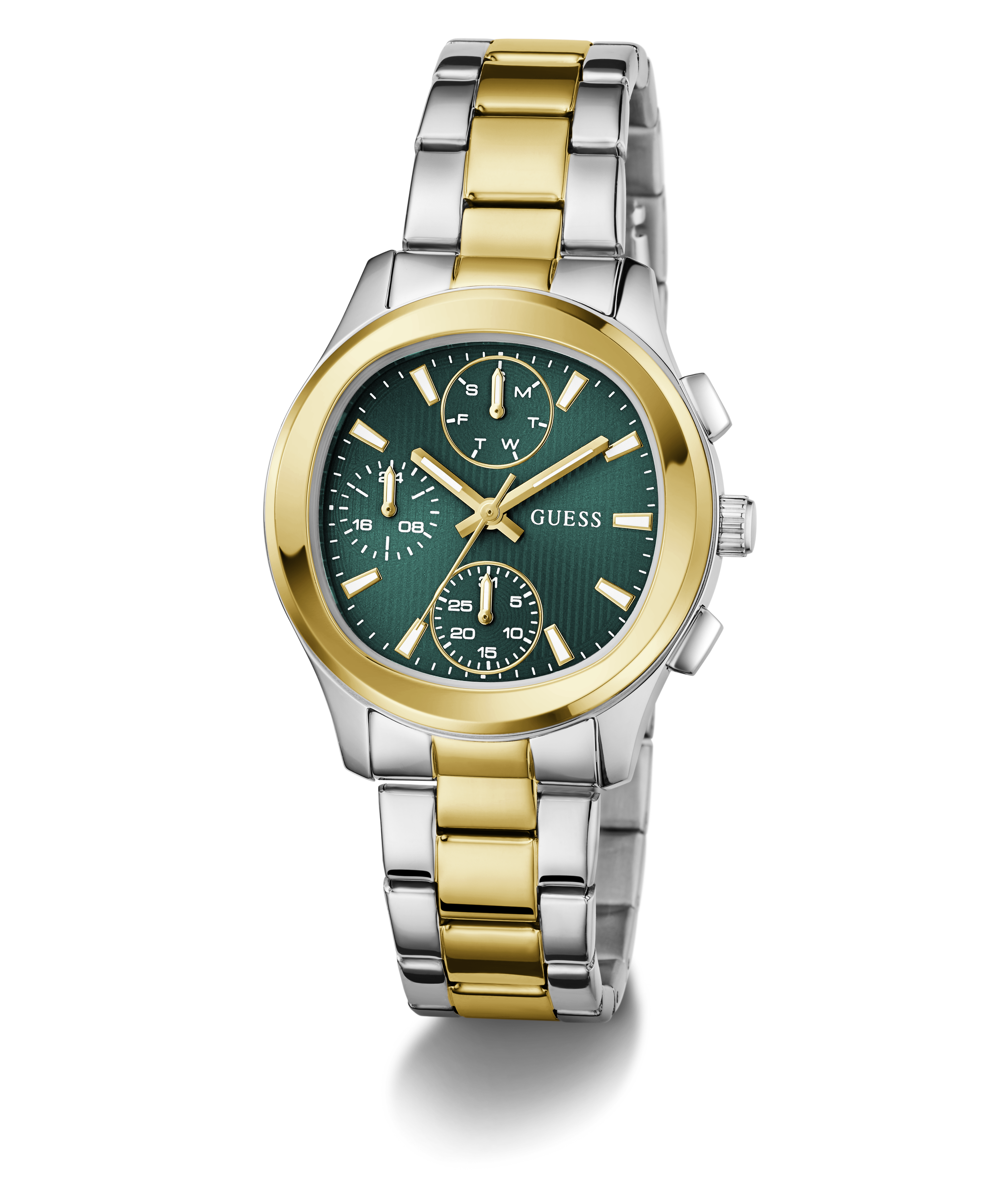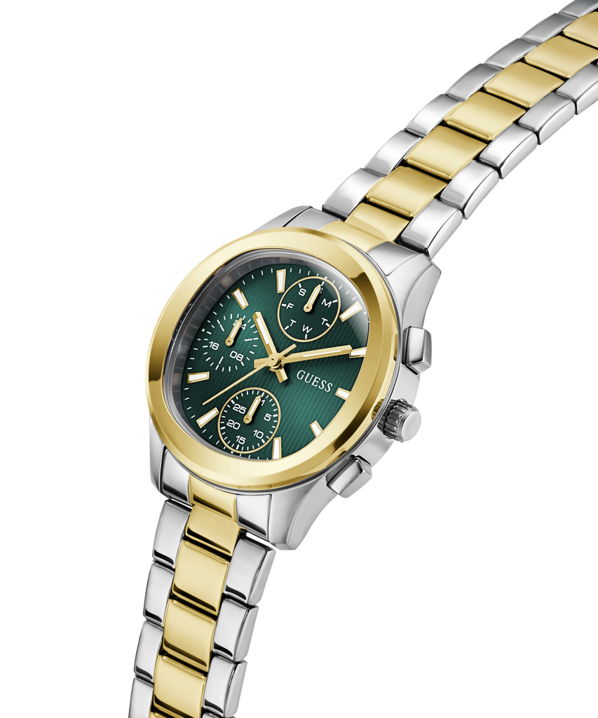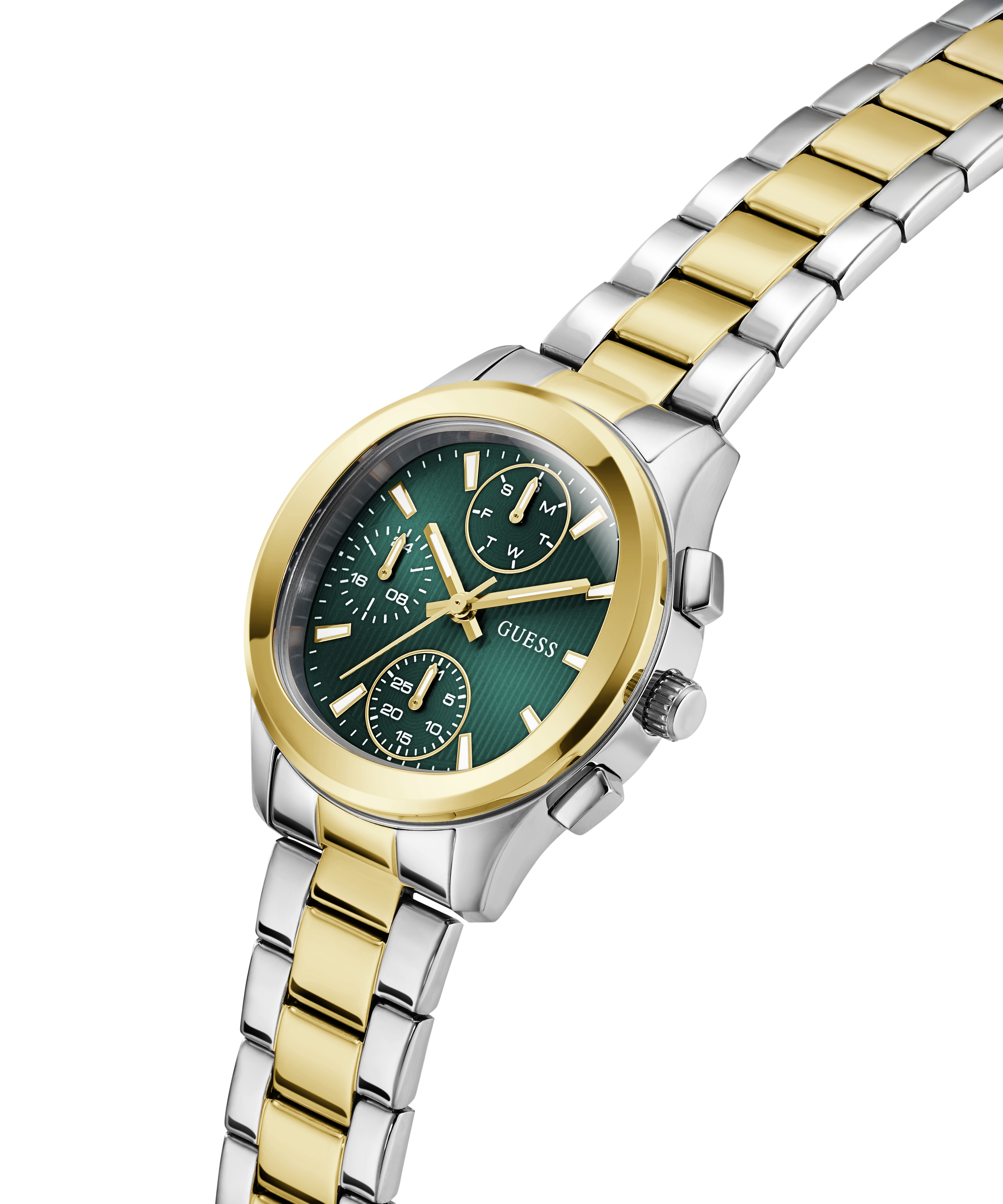 The deep green dial features a subtle texture that catches the light and adds richness to the look, creating a striking balance against the two-tone case. From there, the silver and gold-tone 36mm case paired with a sleek, sculpted two-tone metal bracelet builds the look into a full statement. Its mixed-metal design adds instant versatility, making it effortless to style with anything in your wardrobe.