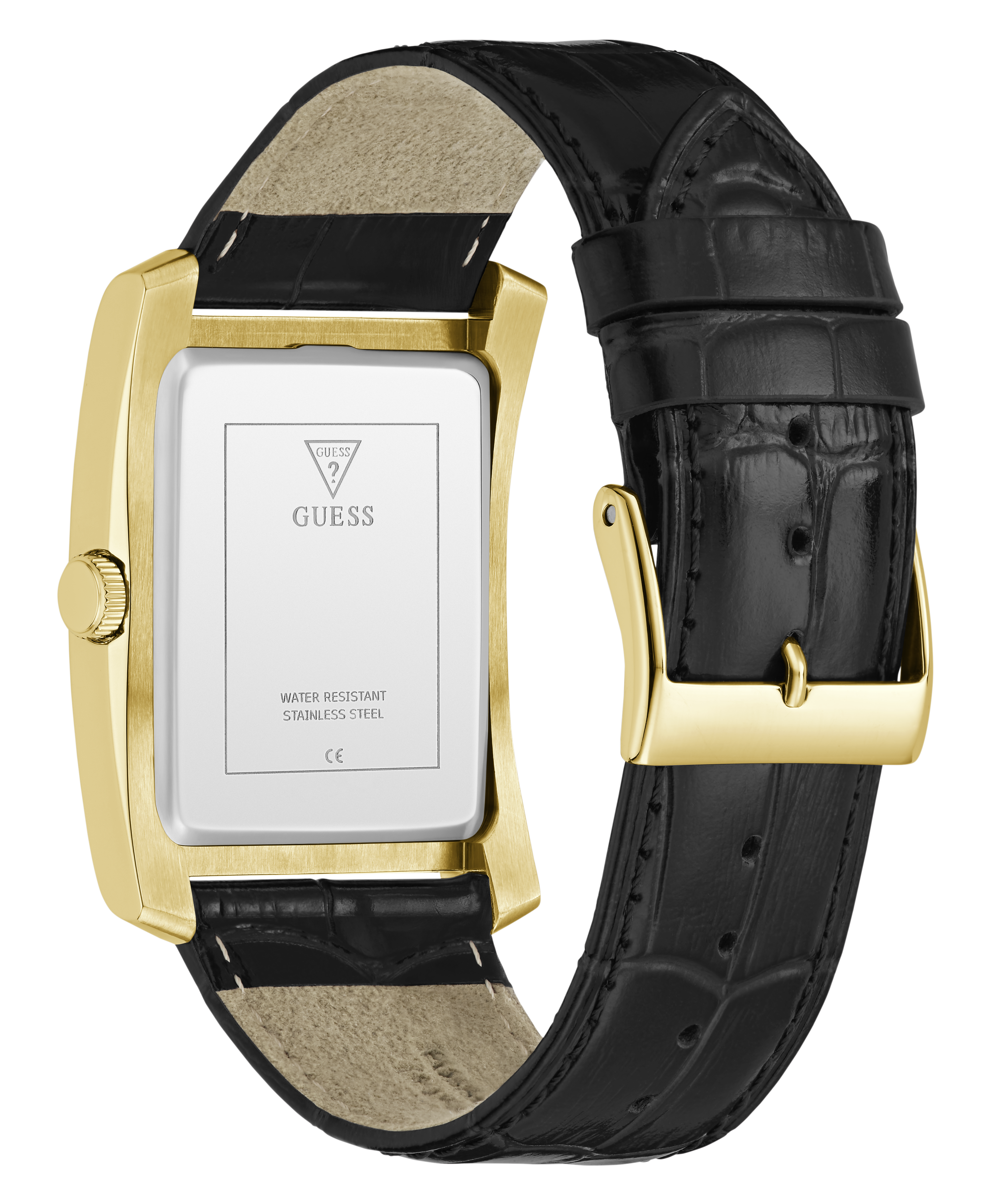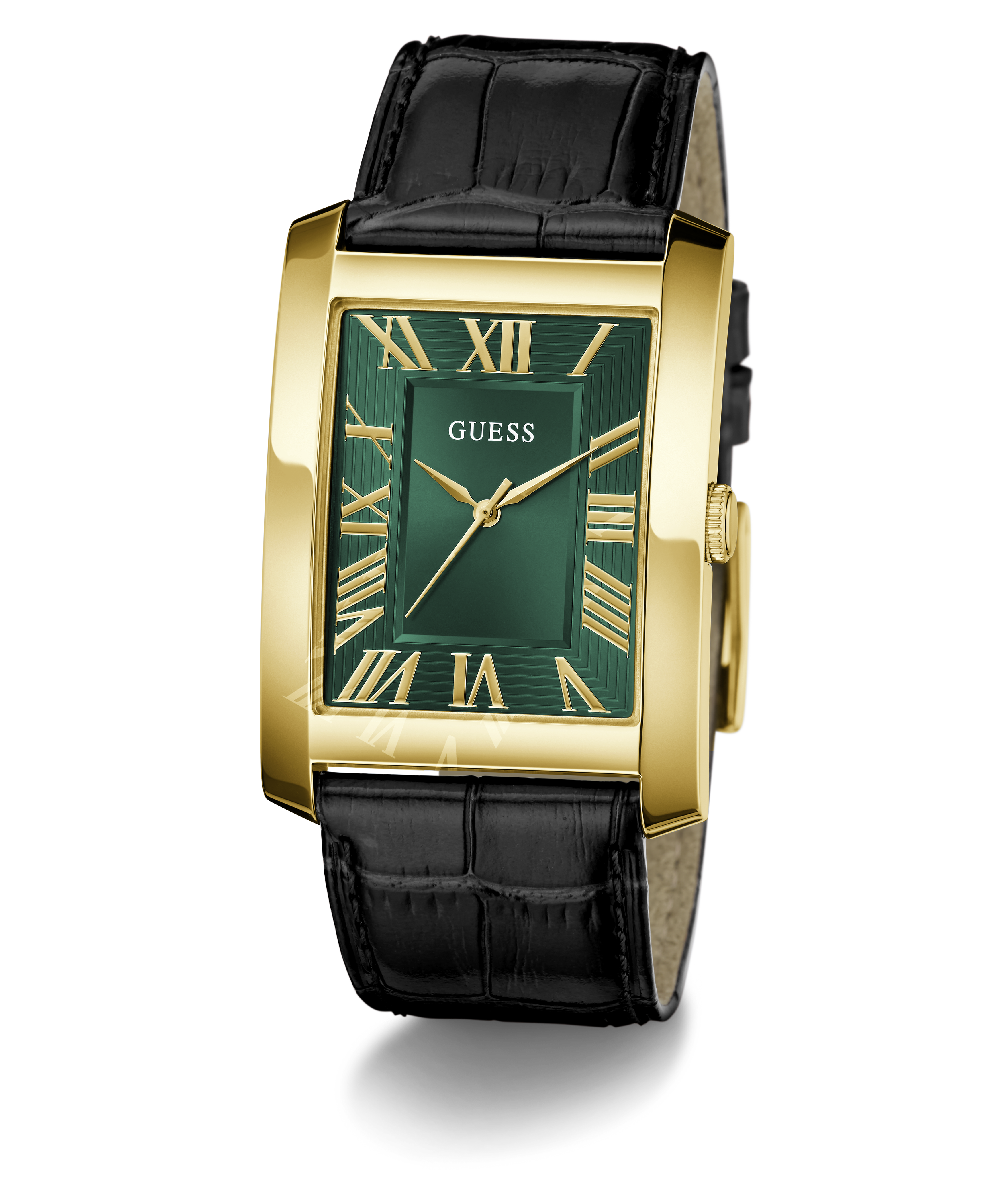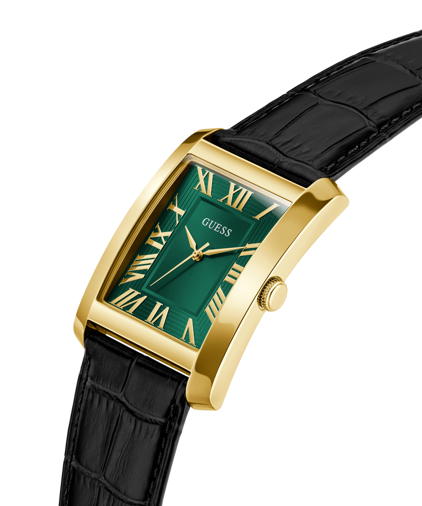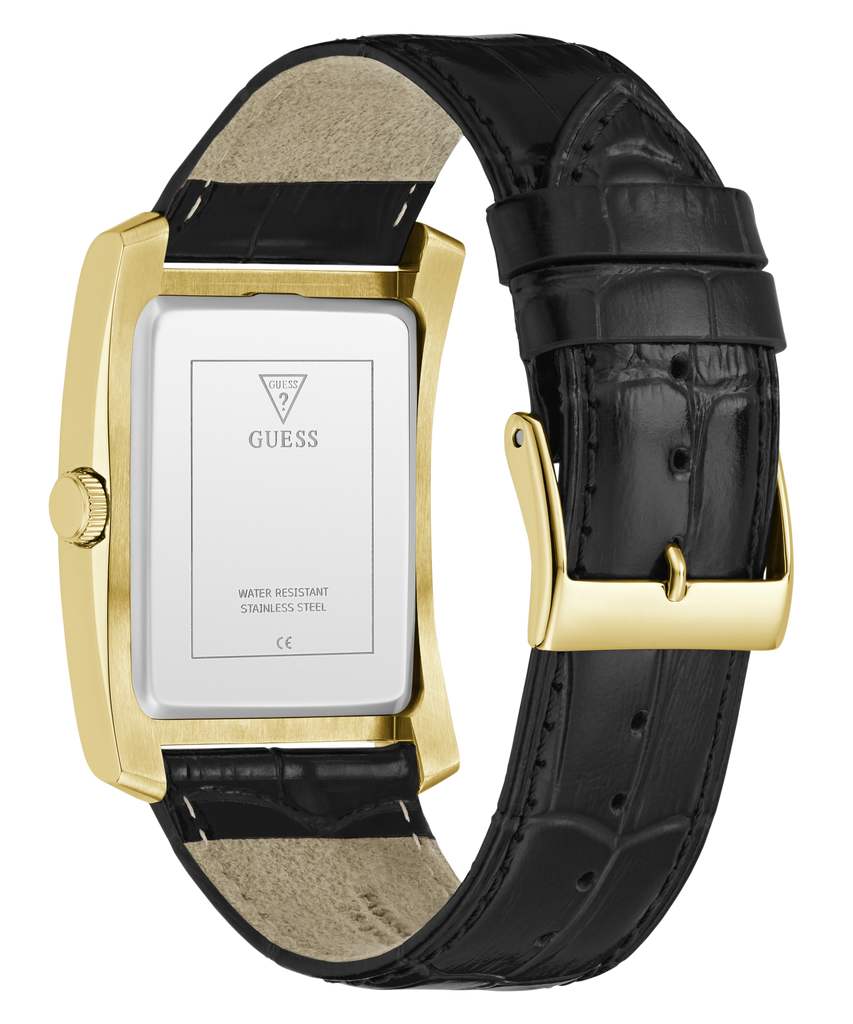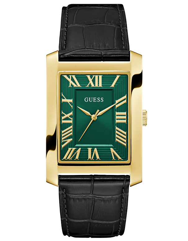 A crisp rectangular case in polished gold tone stainless steel sets the stage for a dial that mixes modern edge with classic refinement.