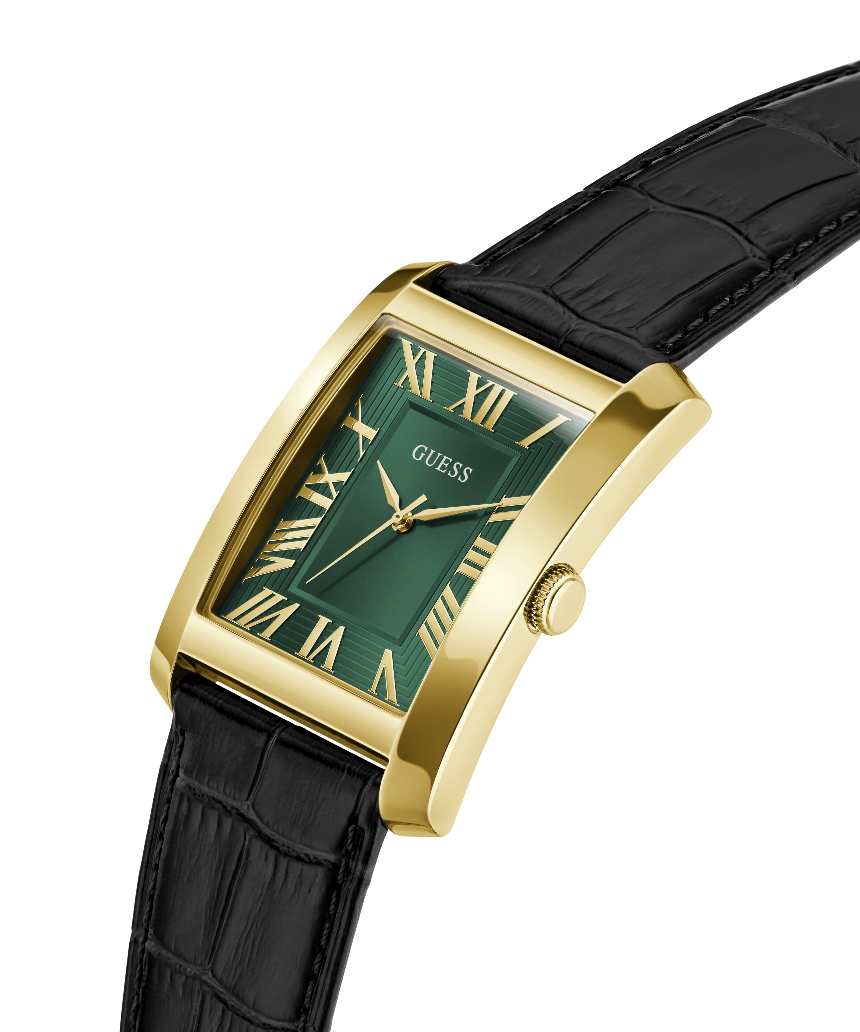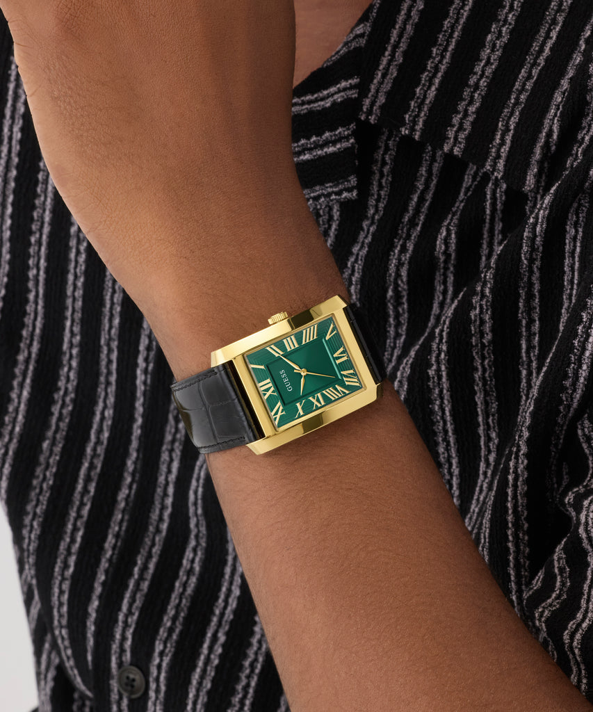 The deep green dial features dimensional detailing and bold Roman numerals that add structure, contrast, and a sense of dressed up sophistication.