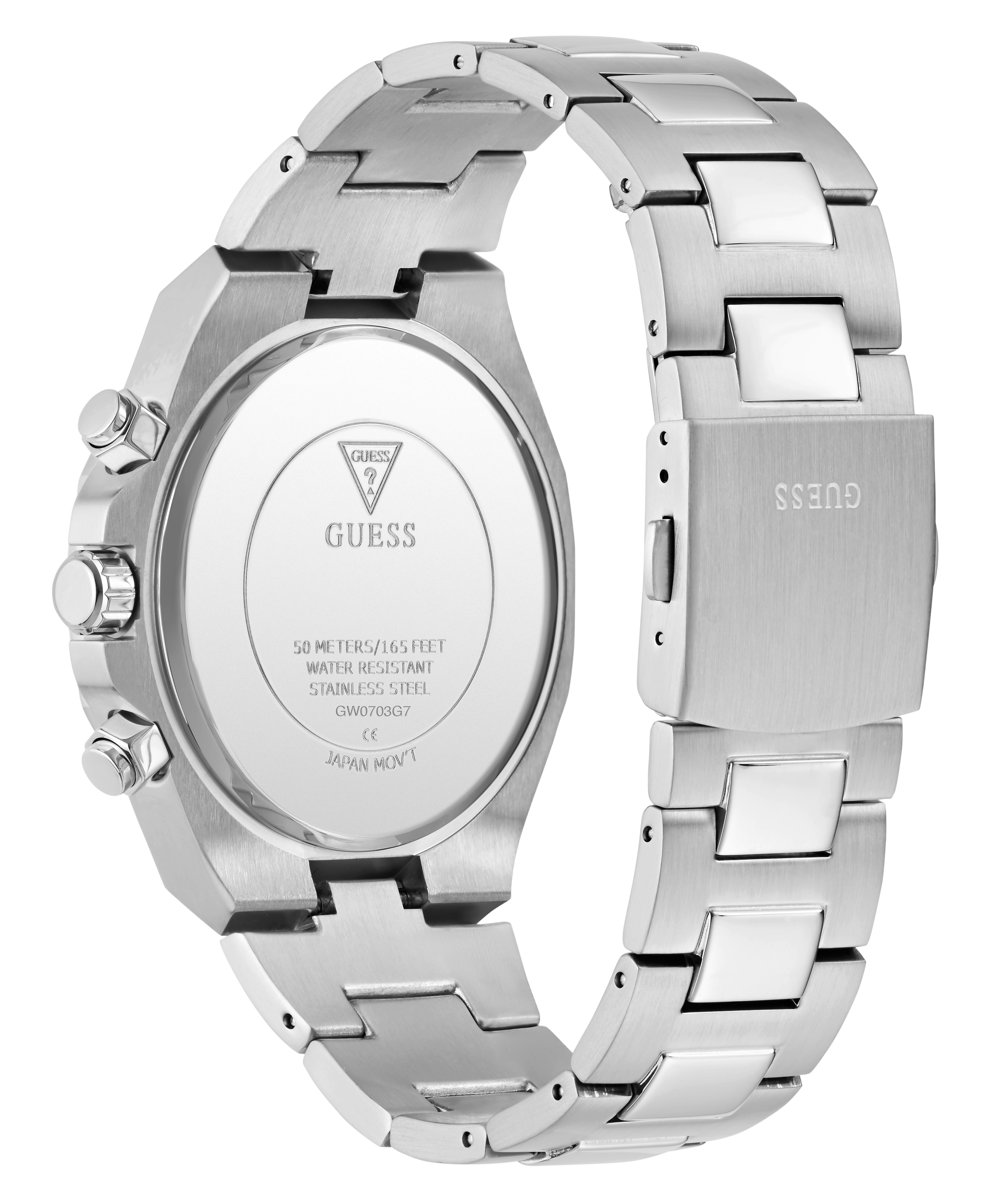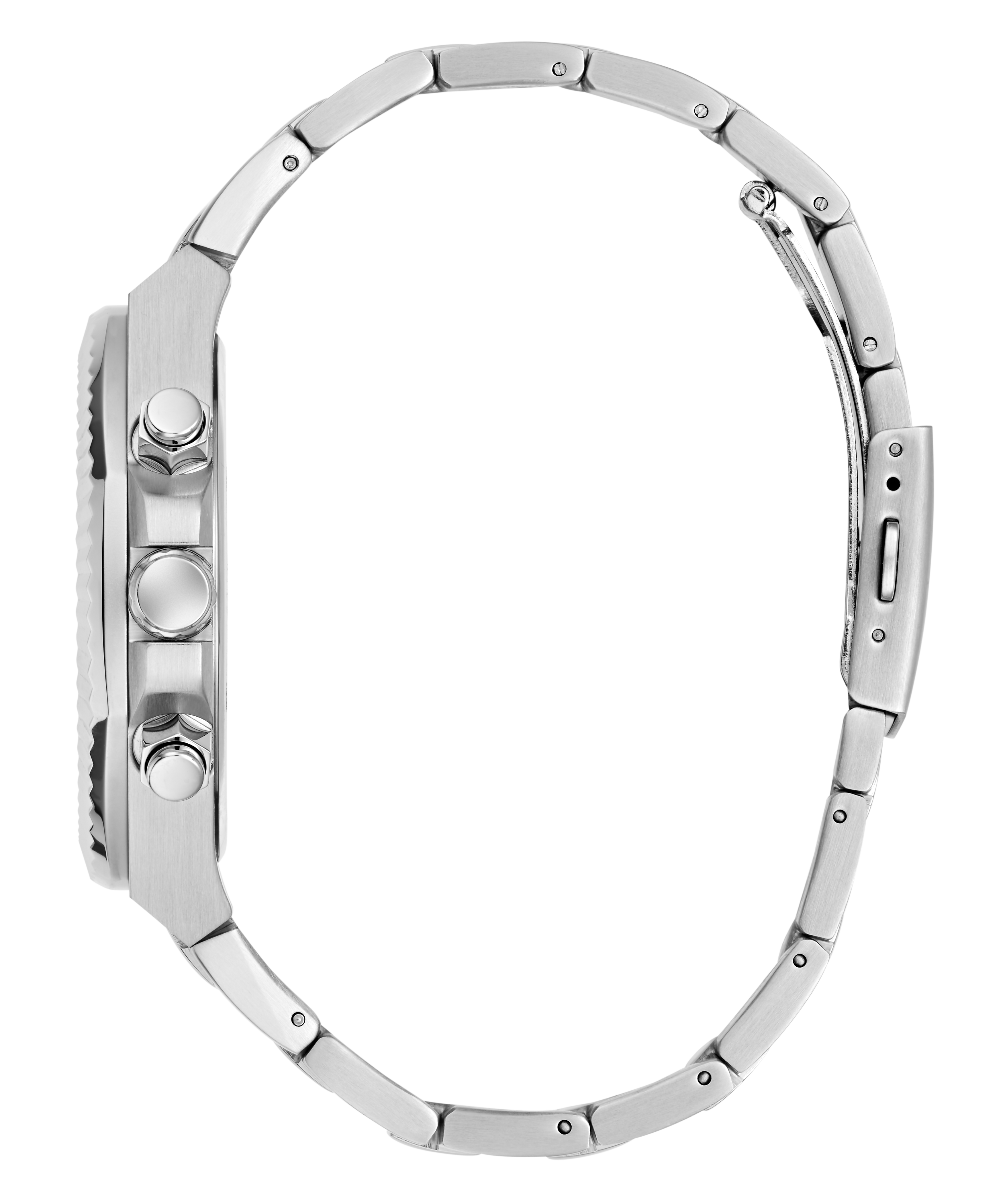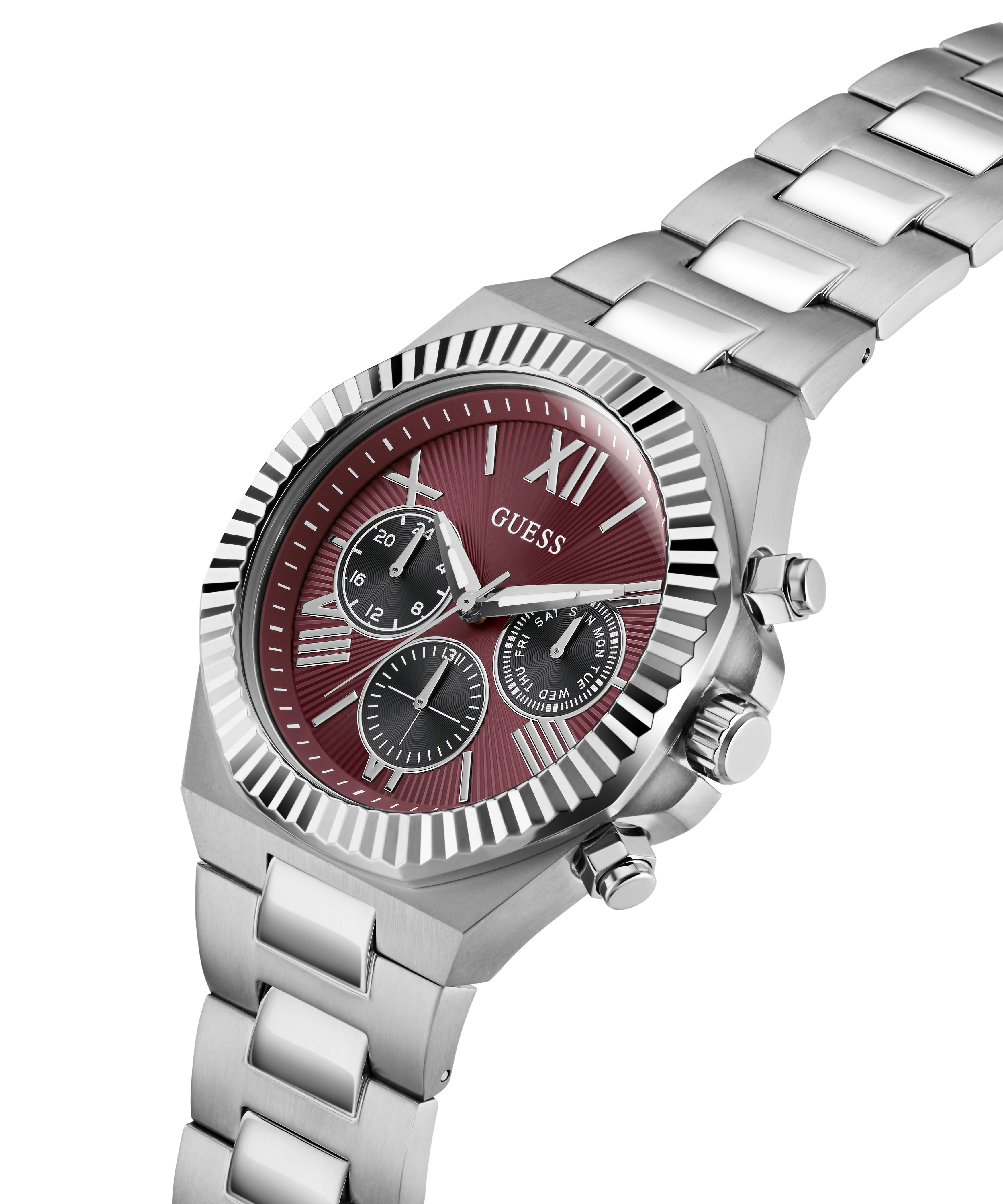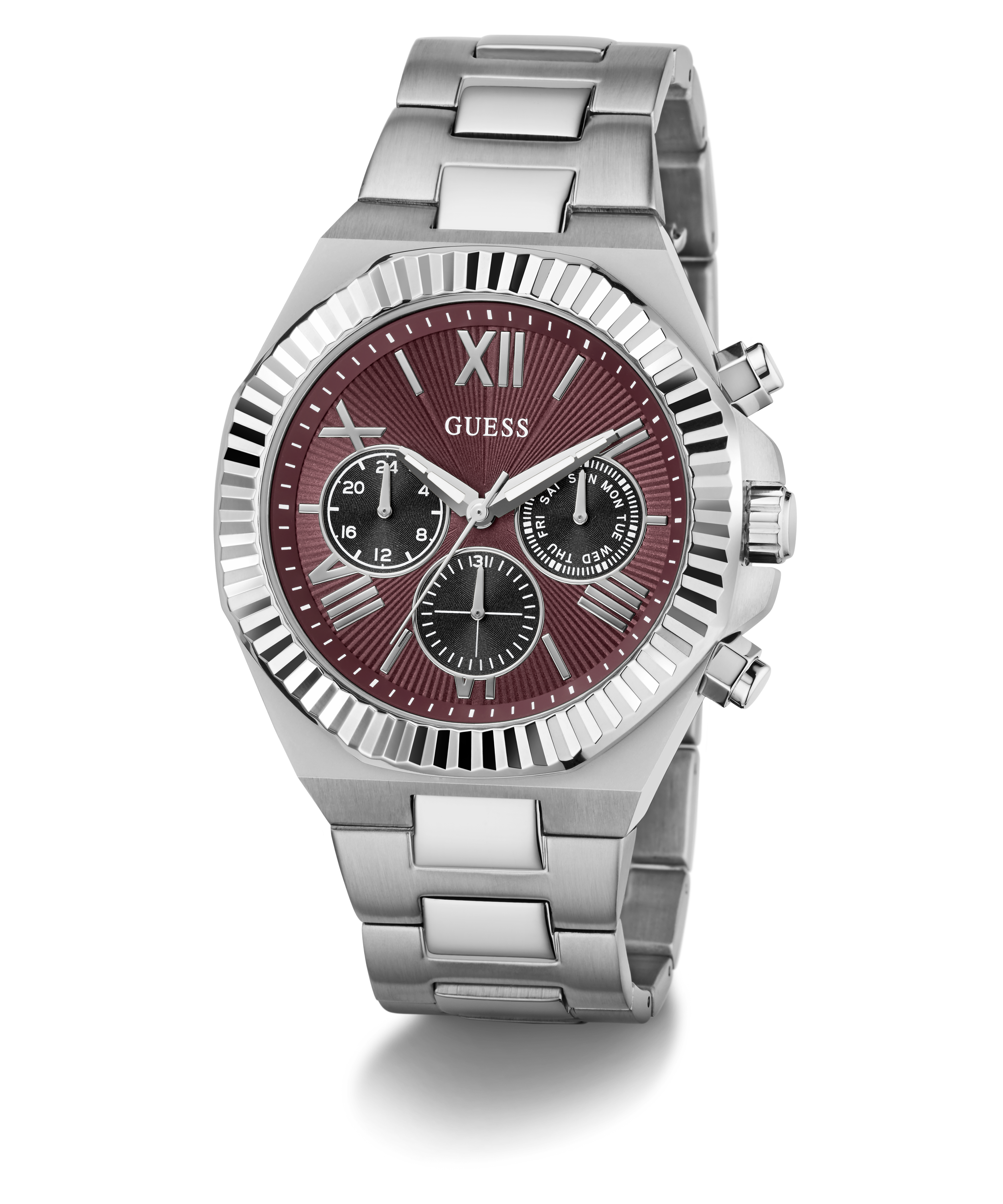 The polished and brushed silver tone stainless steel case is framed by a distinctive coin-edge bezel that adds texture and attitude. Paired with a matching bracelet, the finish stays crisp and refined.