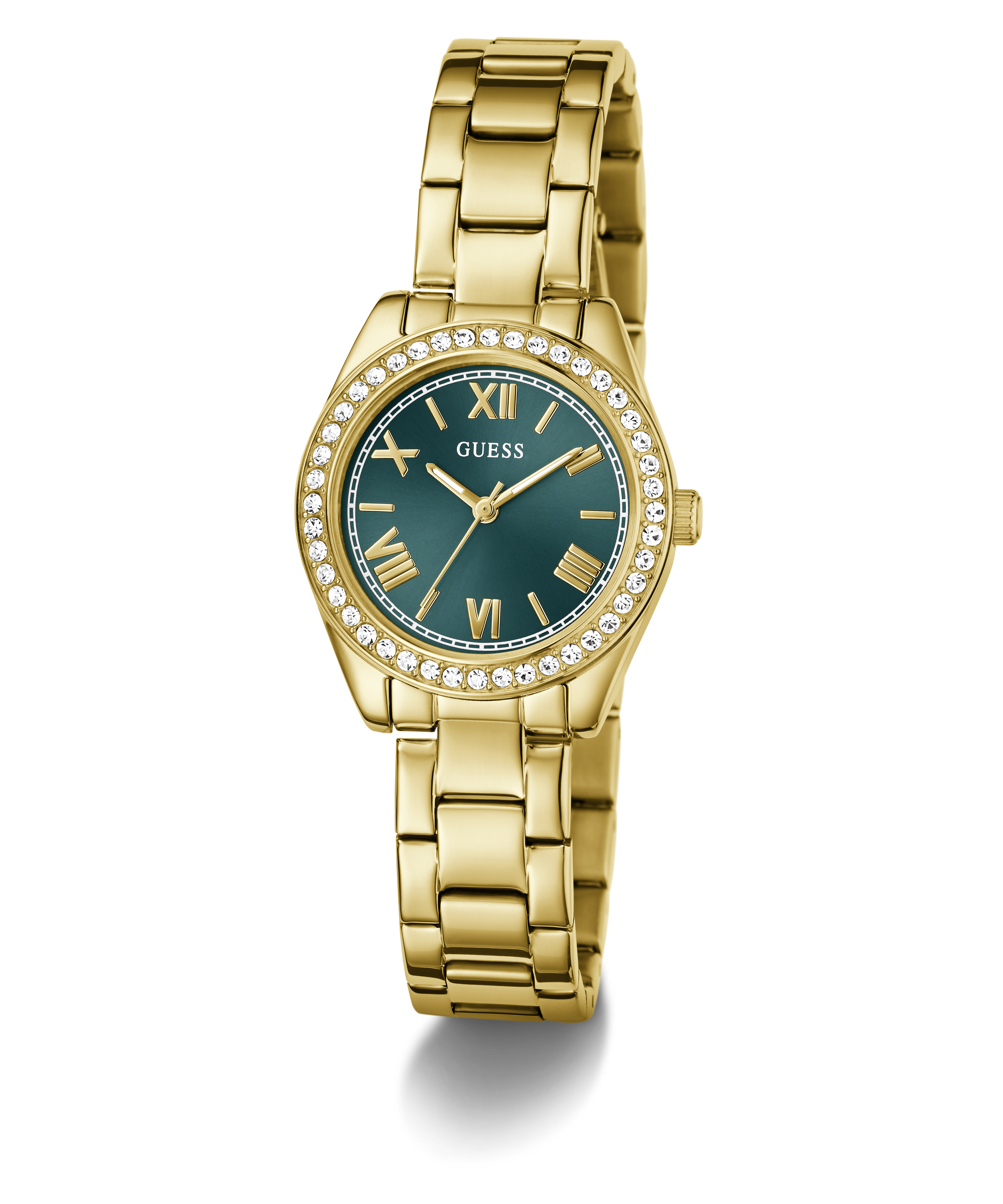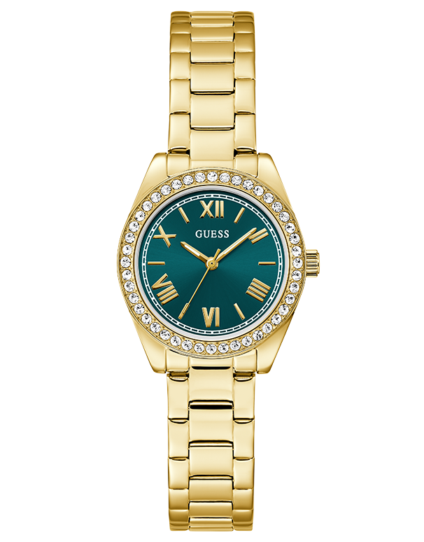This 30mm design brings a polished pop of color with its luminous palette and fresh, feminine edge. The polished gold tone case features a crystal embellished bezel that catch the light instantly, framing the teal sunray dial with a soft, radiant glow. Roman numeral markers add a touch of classic elegance.
