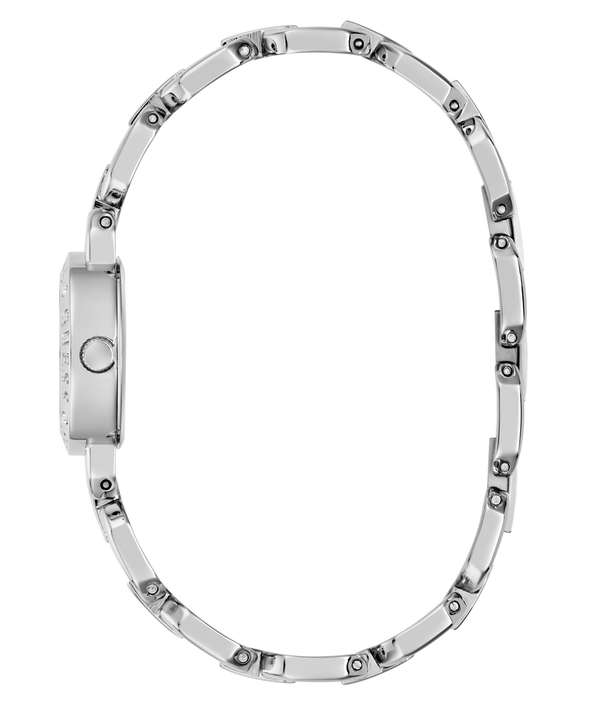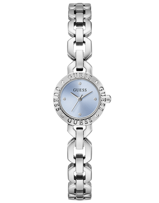 Petite, polished and impossible to overlook, Siren brings a new level of allure to a 23 mm silhouette. The polished silver-tone case features a crystal-accented GUESS logo bezel that draws the eye towards the ice blue sunray dial.