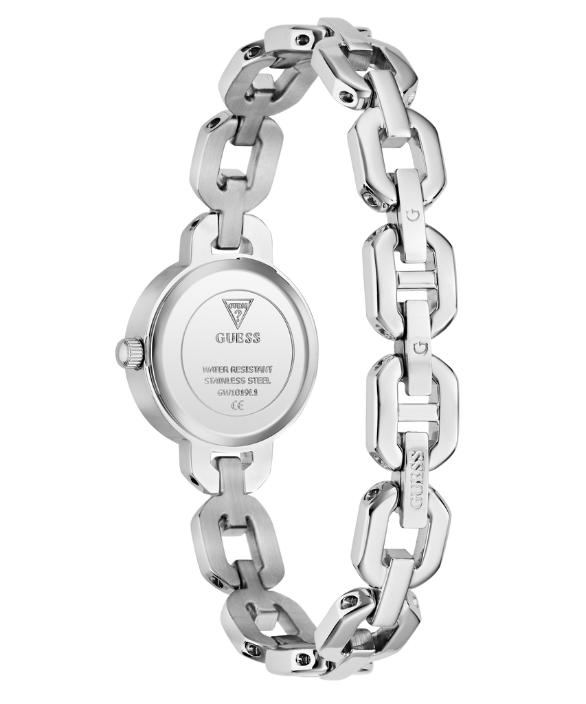 A matching silver-tone bracelet completes the look with sleek chain links and self-adjustable G-links that create a smooth fit. The refined finish, soft color palette and radiant dial come together to create a balance of charm and edge.