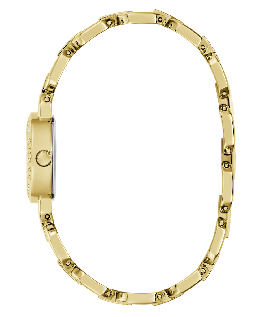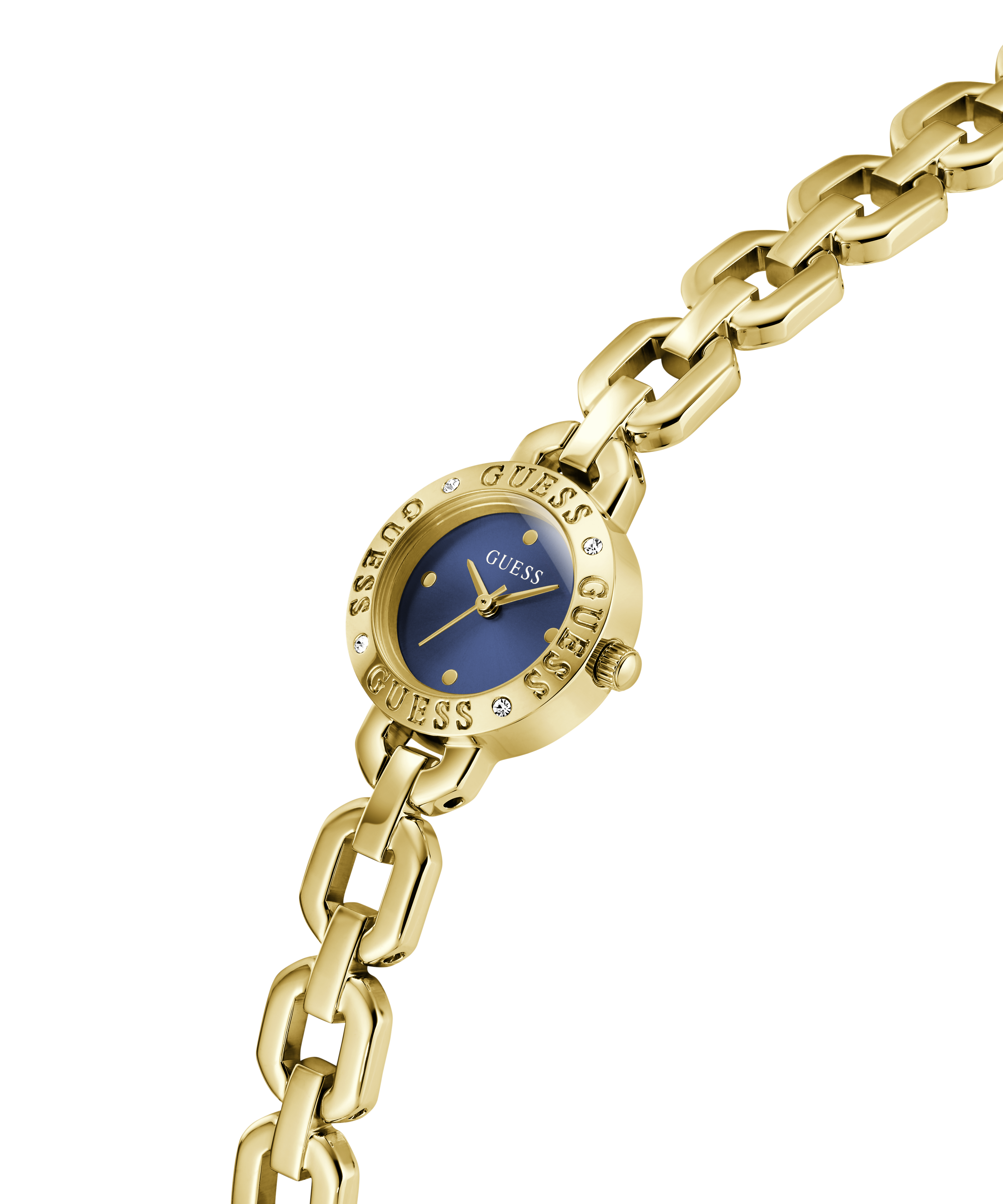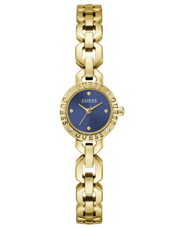Petite, polished and impossible to overlook, Siren brings a new level of allure to a 23 mm silhouette. The polished gold-tone case features a crystal-accented GUESS logo bezel that draws the eye towards the deep blue sunray dial.