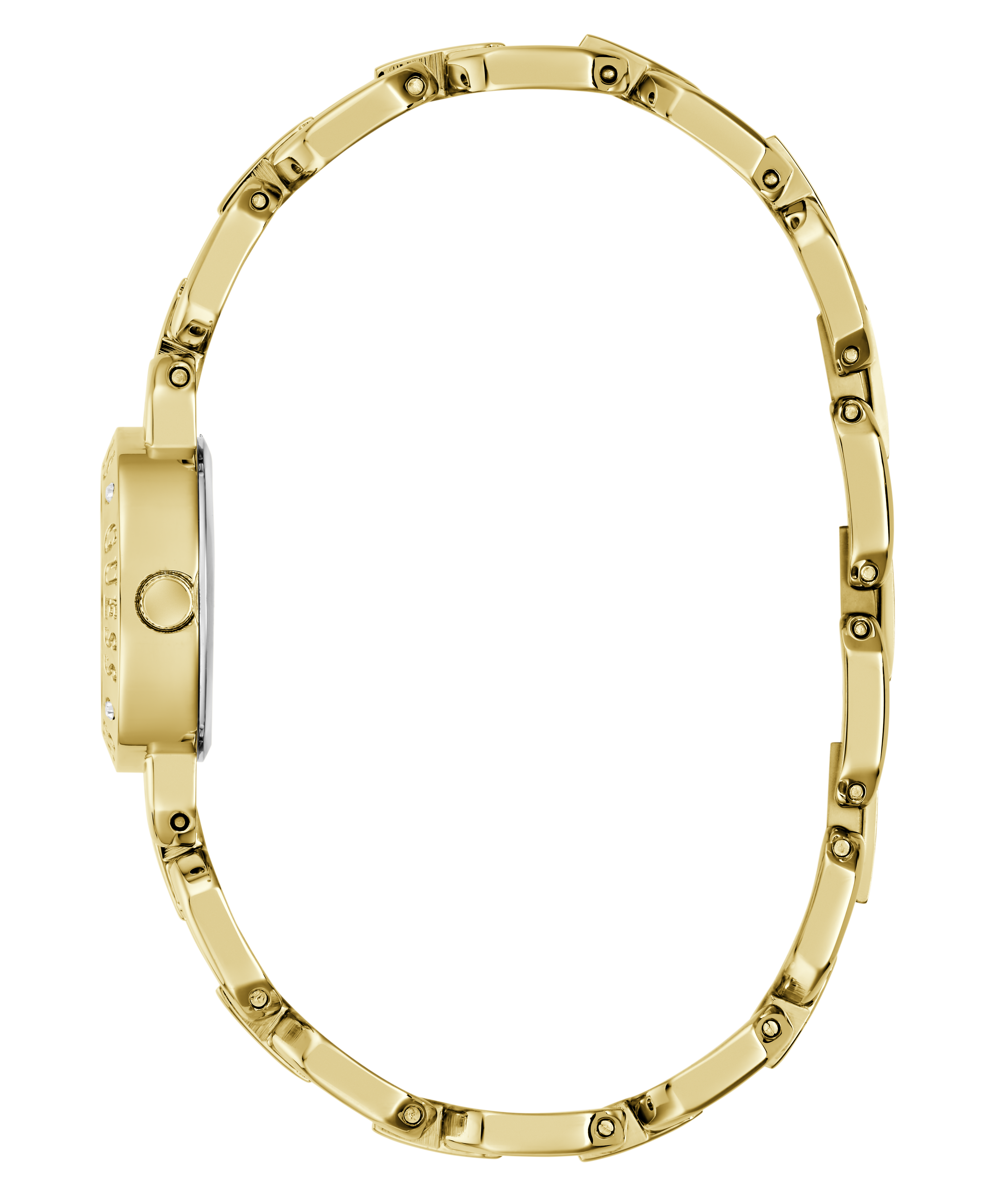 A matching gold-tone bracelet completes the look with sleek chain links and self-adjustable G-links that create a smooth fit. The refined finish, soft color palette and radiant dial come together to create a balance of charm and edge.