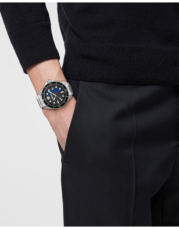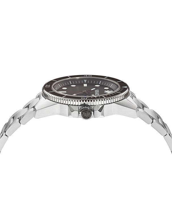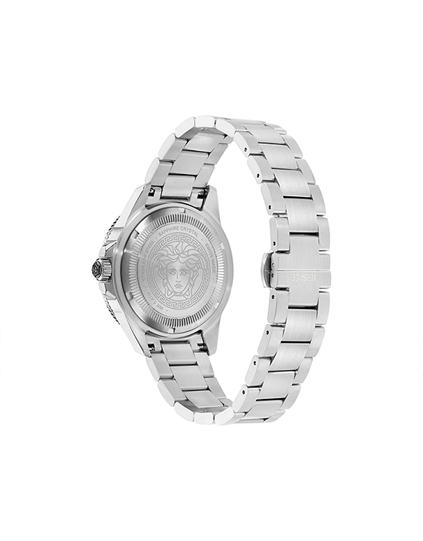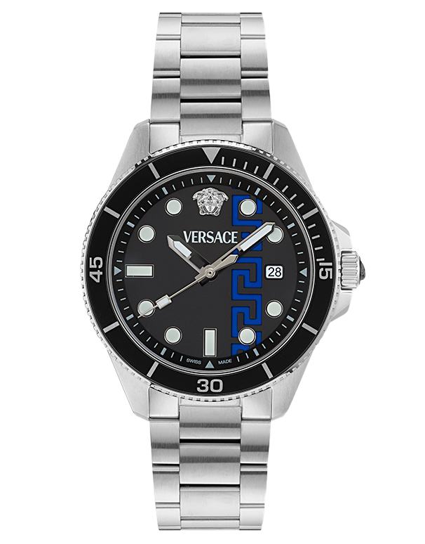 Dial: Black contrasting Greca, Medusa head and Versace logo at 12h