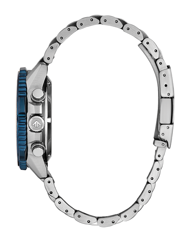 Inspired by professional pilots and styled in the signature blue and yellow colours of the iconic Blue Angels, the Promaster Sky men’s chronograph from Citizen fuses precision engineering with bold design. The sleek stainless steel case is paired with a blue-plated rotating bezel featuring a pilot’s slide rule and tachymeter, combining form and function in perfect flight.