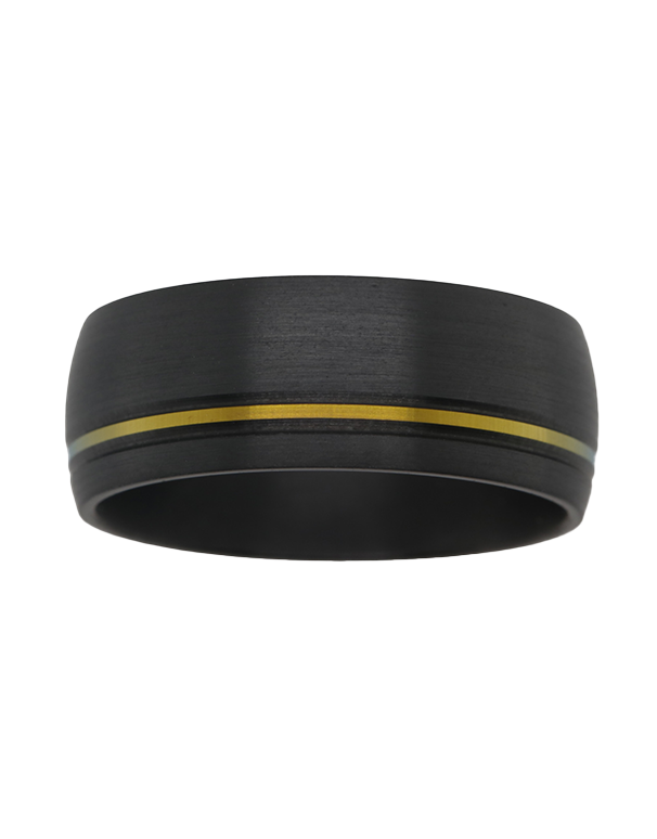 | Ziro Collection Ring Specify your ring size at checkout A black Zirconium ring, featuring a gold coloured groove achieved through a meticulous anodising process on the zirconium band. 8mm width. Various sizes available. Zirconium is naturally a hard, lustrous, silvery coloured metal which is produced from the mineral Zircon (ZrSiO4) which turns black when exposed to extreme heat. The metal is extremely corrosion resistant due to the formation of a stable oxide film and is unaffected by most acids and alkalis. It will not tarnish and is completely hypoallergenic. |