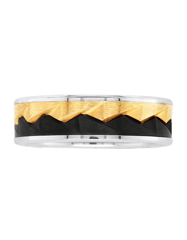 Made from 9ct yellow gold, black Zirconium and Sterling Silver, featuring a wave pattern, 7mm width.