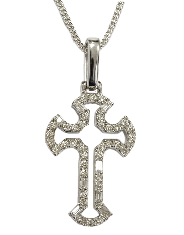 10ct White Gold Diamond Set Cross Pendant featuring Tapered Baguette and Brilliant Cut Diamonds TDW 0.30ct