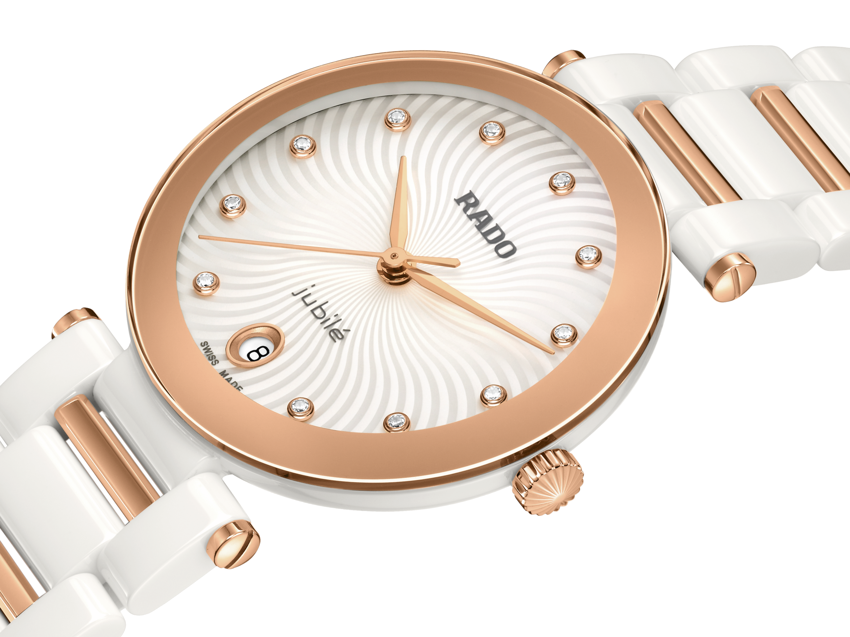 Case: 31 mm monobloc polished white high-tech ceramic with rose gold metallised border