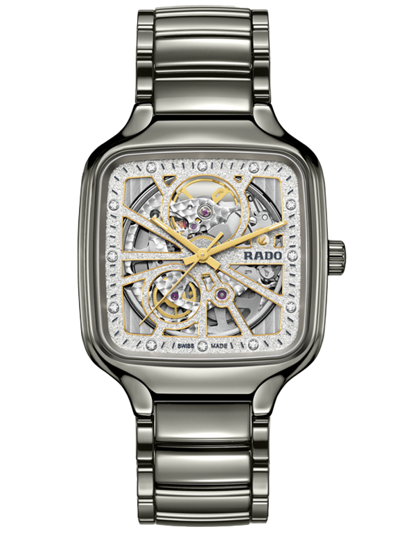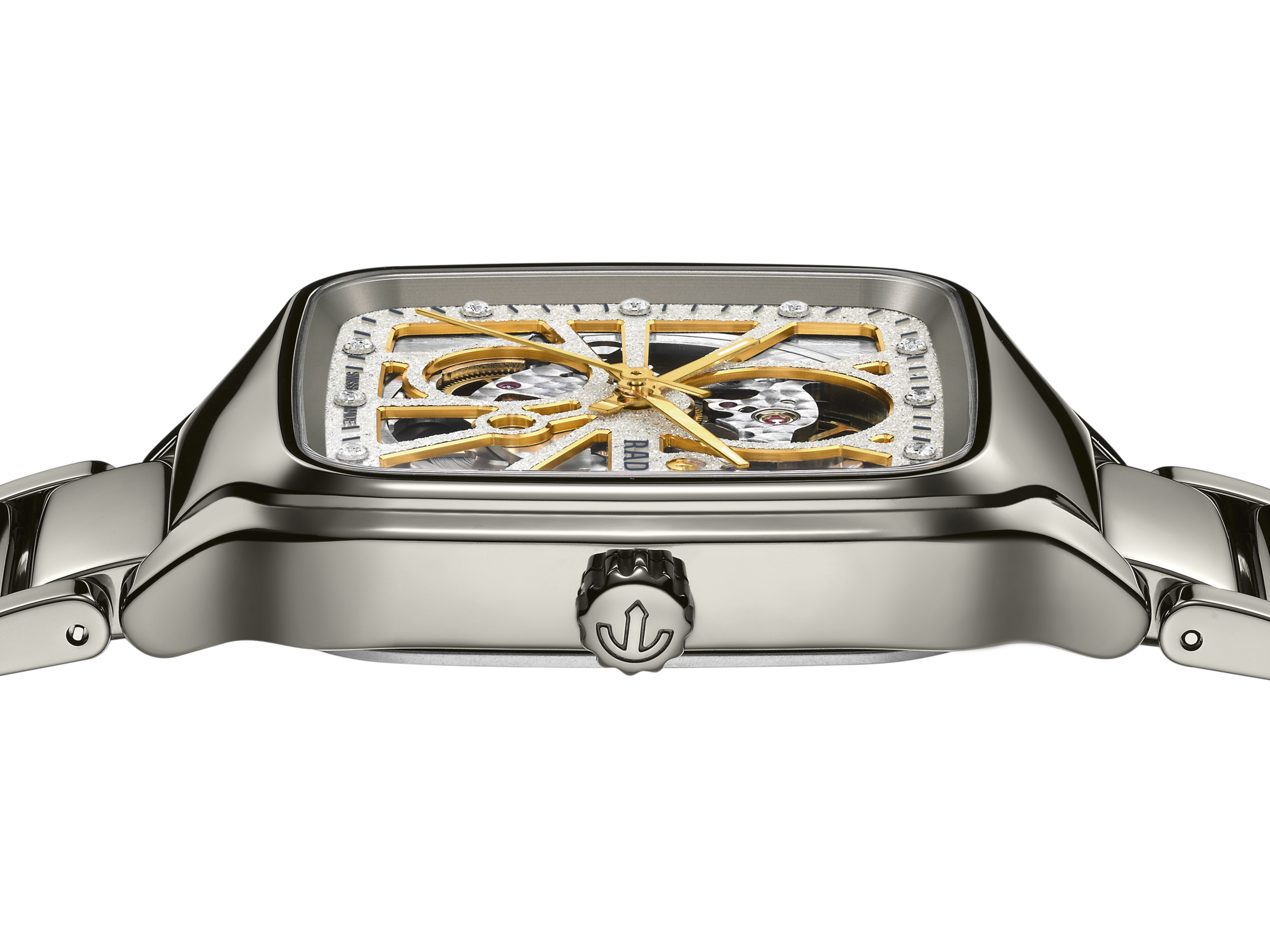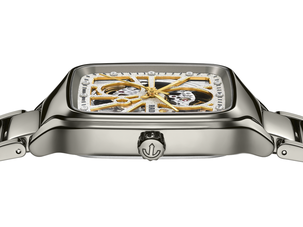 Rhodium-coloured dial with electro-formed diamond-powder-like finish; 12 jubilé diamond indexes; raised Rado logo, minute track and markings via galvanic growth; grey minute track in low relief; yellow gold-coloured hour and minute hands with Super-LumiNova® highlights; yellow gold-coloured seconds hand; open-heart cutaway windows revealing the movement.