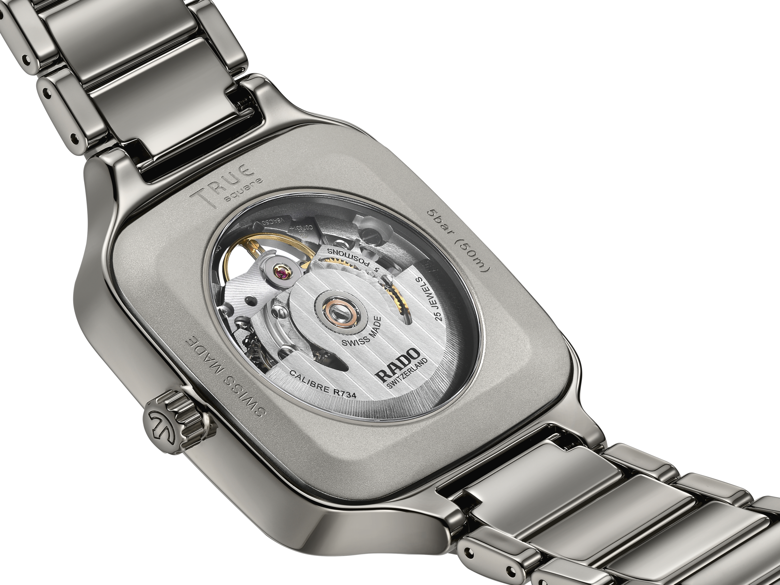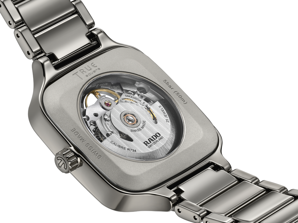 Automatic, Rado calibre R734; 80-hour power reserve; movement tested in 5 positions; antimagnetic Nivachron™ hairspring for enhanced accuracy and stability.