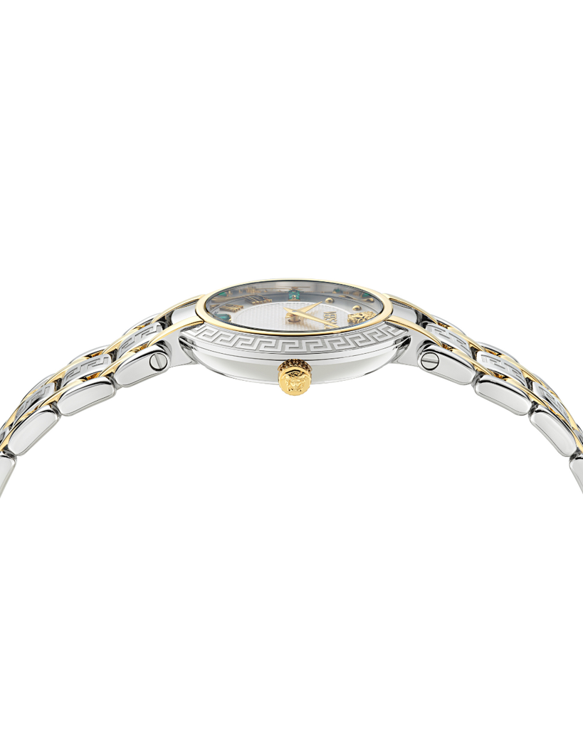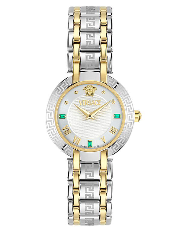 Dial: White silver dial with emerald stones at 3h, 6h and 9h, versace logo and Medusa head at 12h